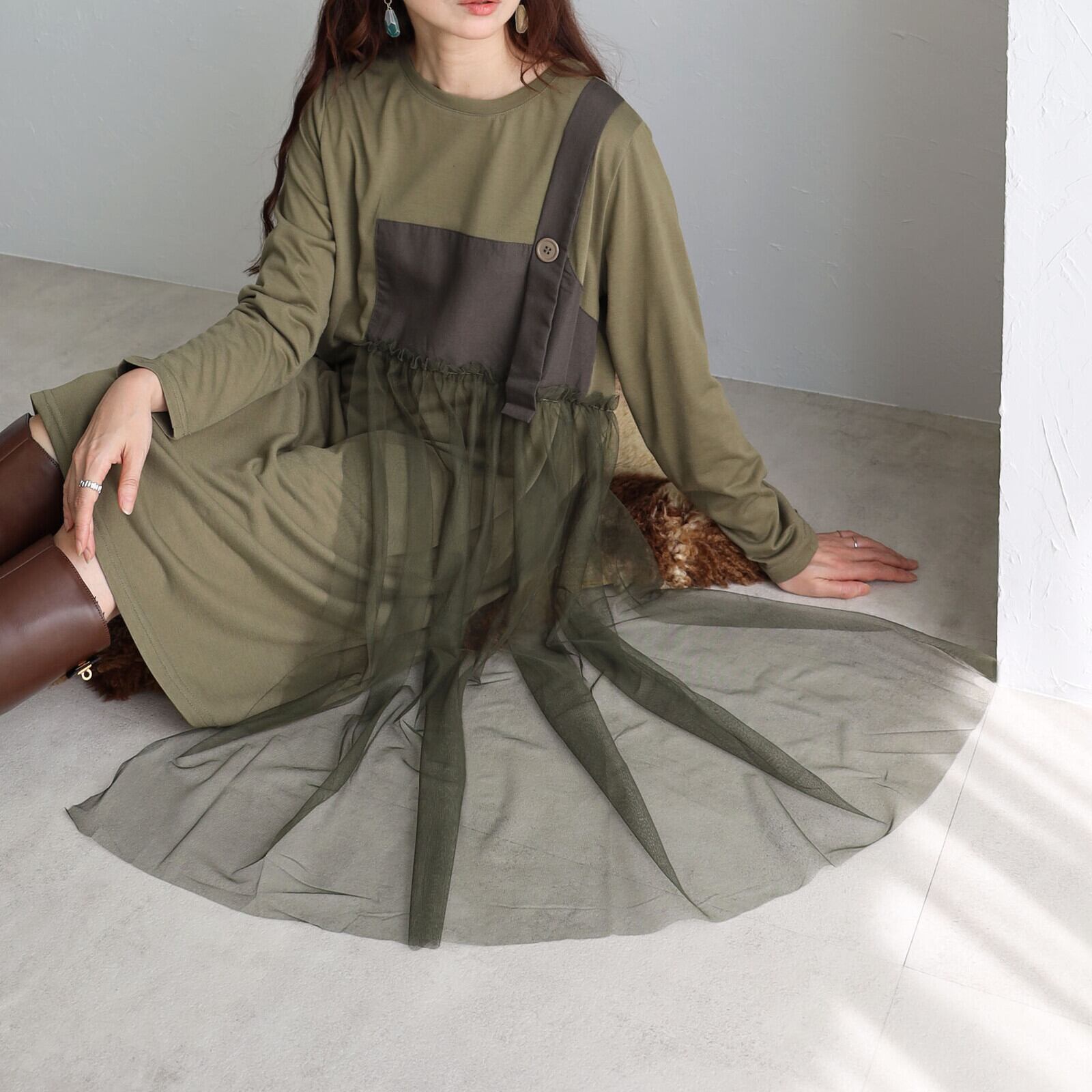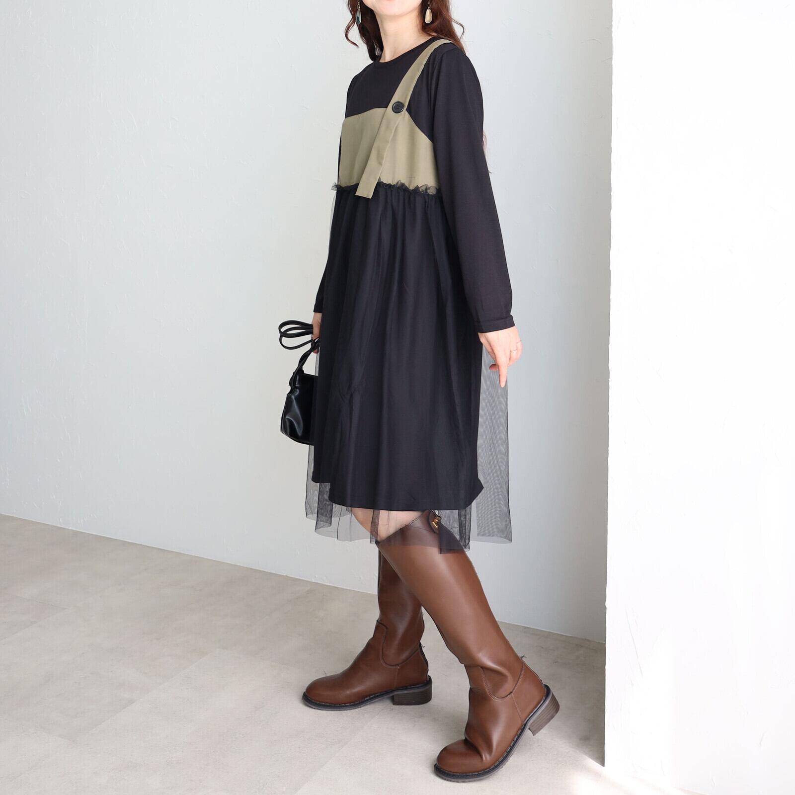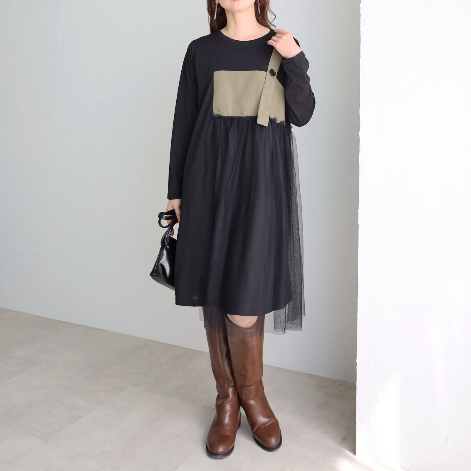 チュール×ワンピースがさりげなく上品な華やかさを感じる1枚⭐︎ 心地よさとオシャレを両立させたワンピースゆったりと着心地でウエスト周りもカバーお出かけ着にはもちろんデイリーにも幅広く活躍します。 【素材・成分】 ポリエステル100% メッシュ ポリエステル100% 別布 ポリエステル80% 綿20%