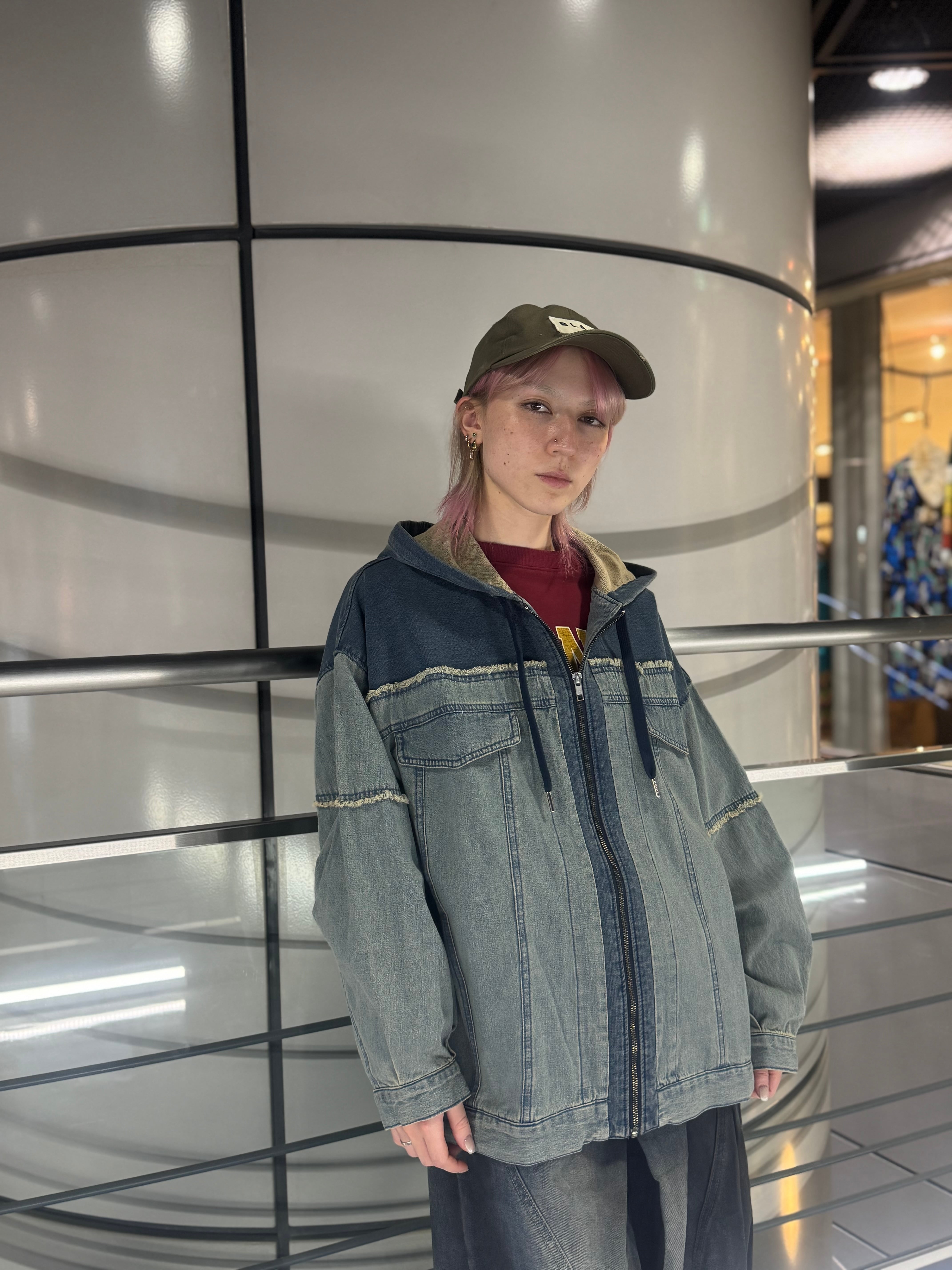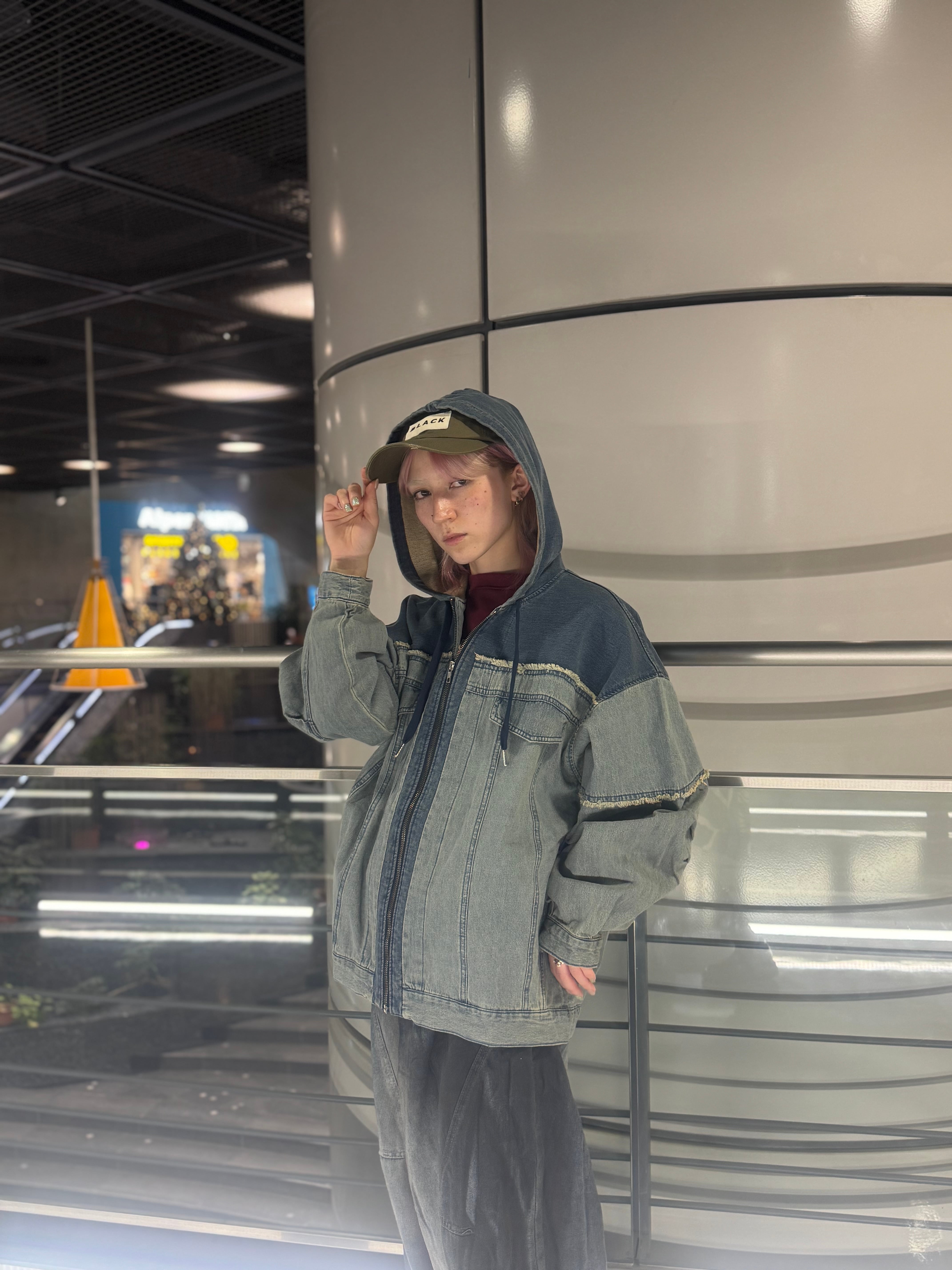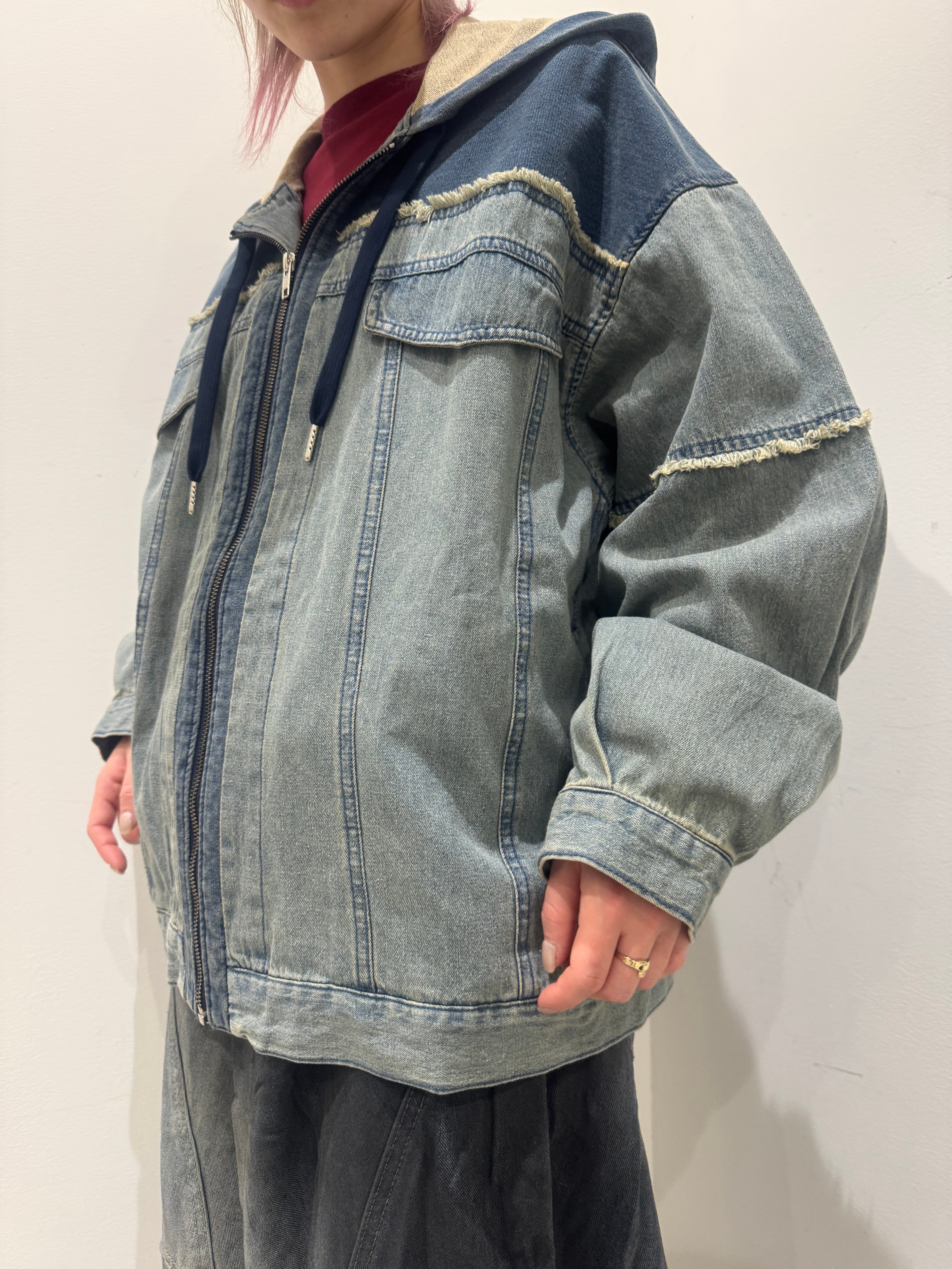デニムジップパーカー サイズ フリー モデル身長159 肩幅59 身幅63 着丈63 素材 本体 綿100% 別布 綿98% ポリウレタン2%