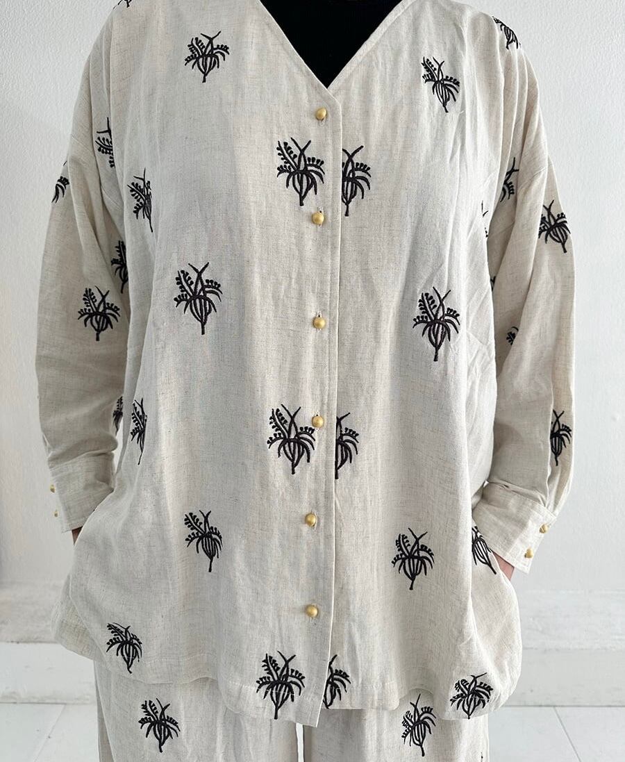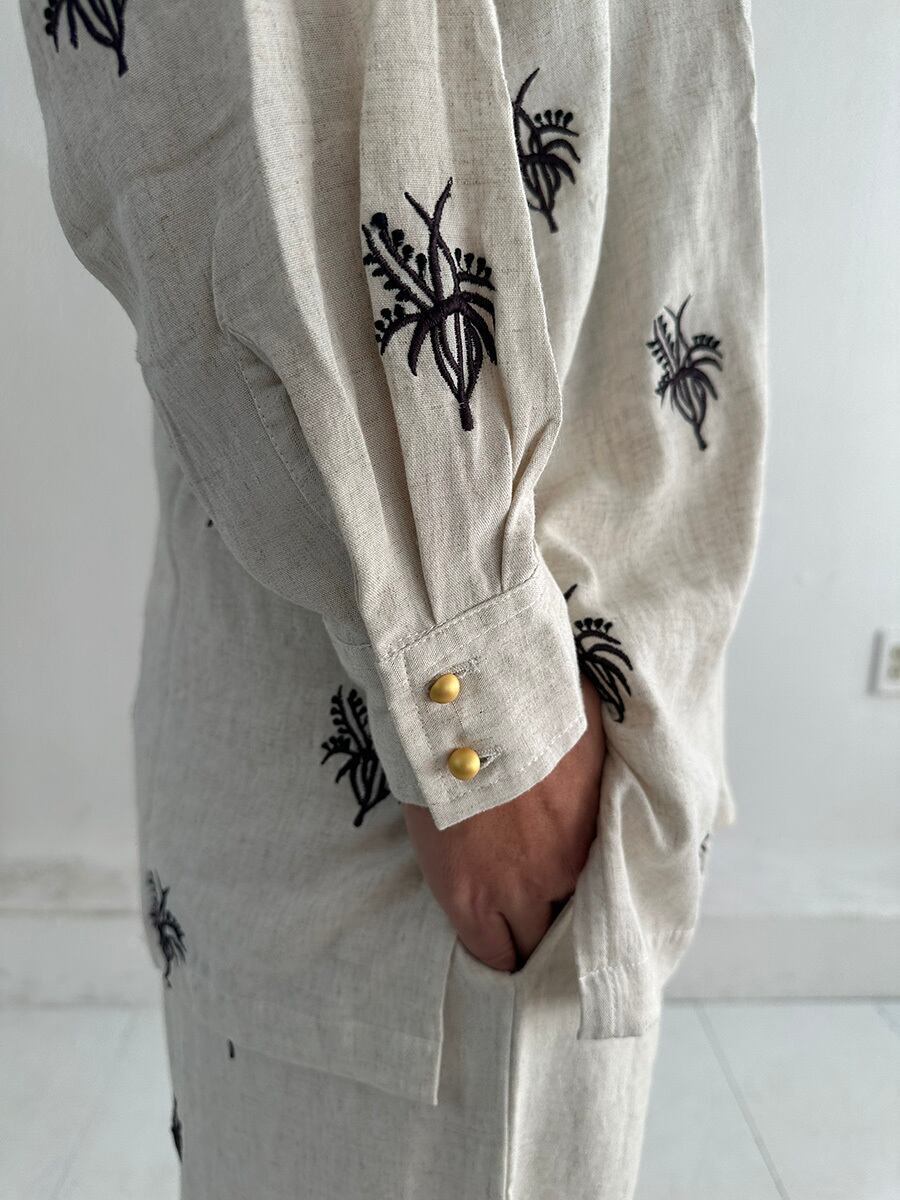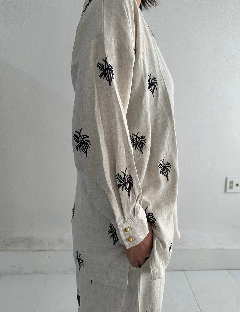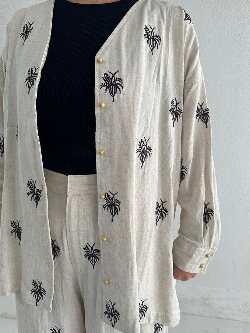 同じ刺繍のパンツとセットアップで着ていただくのおすすめです。