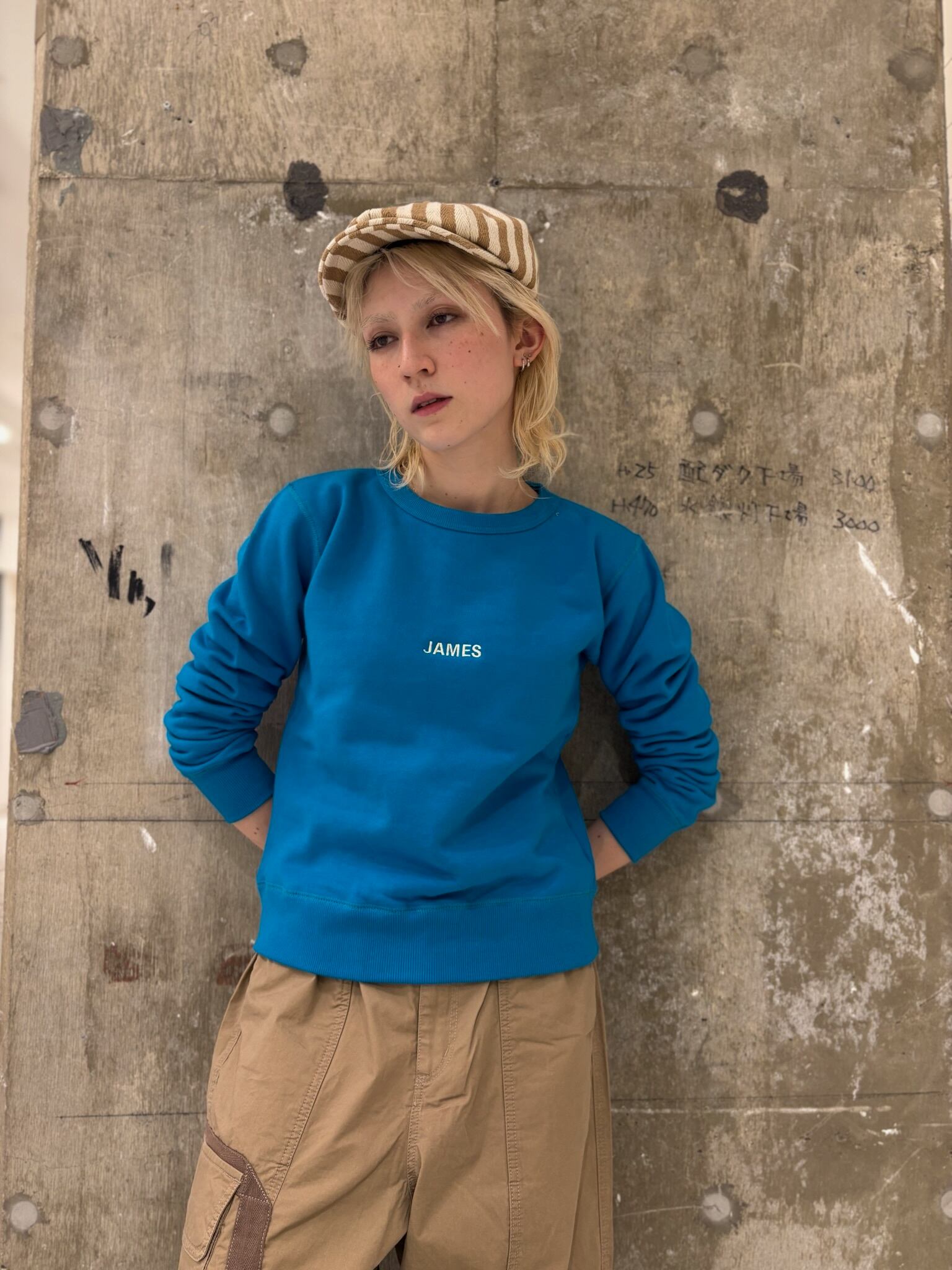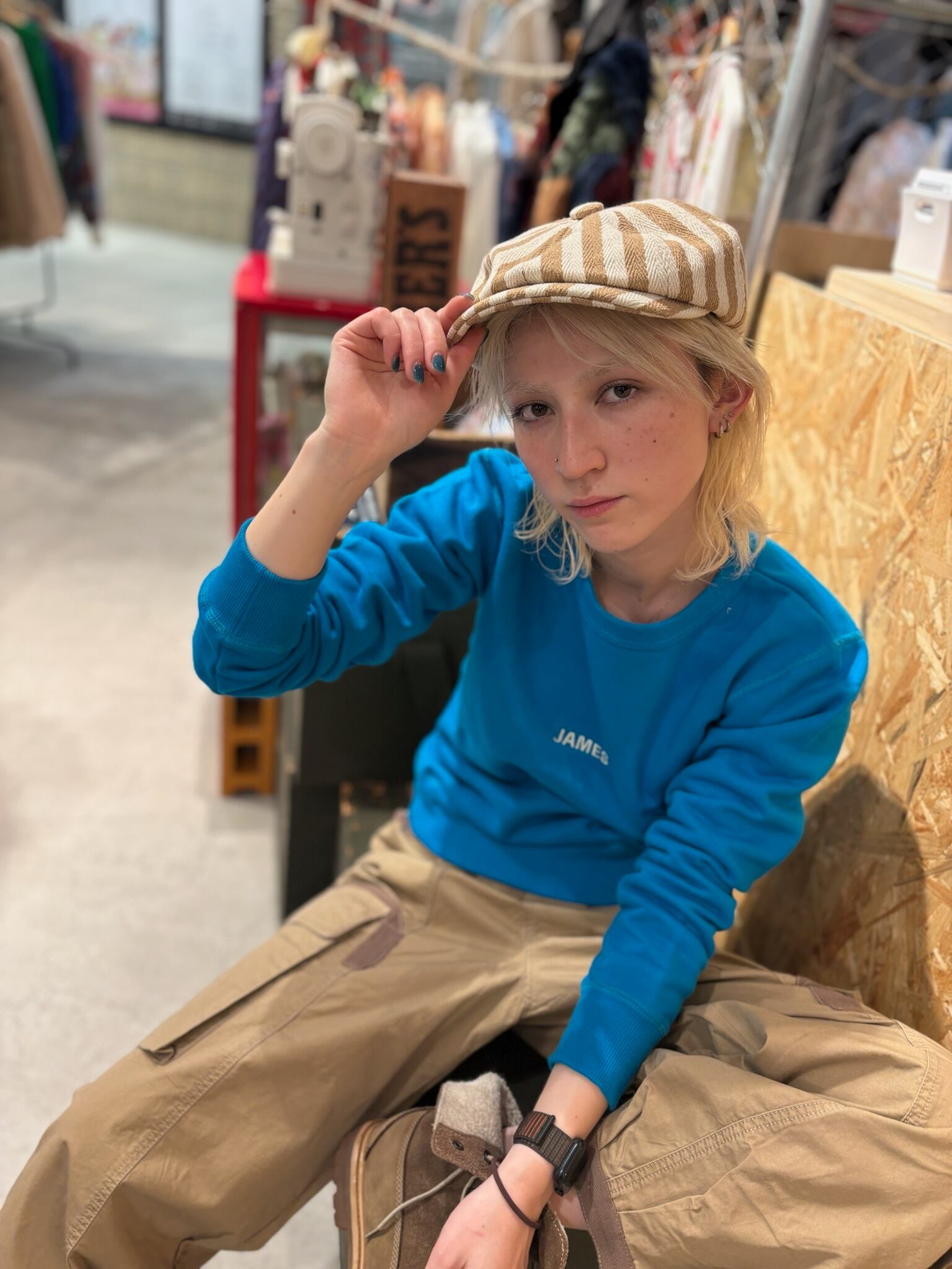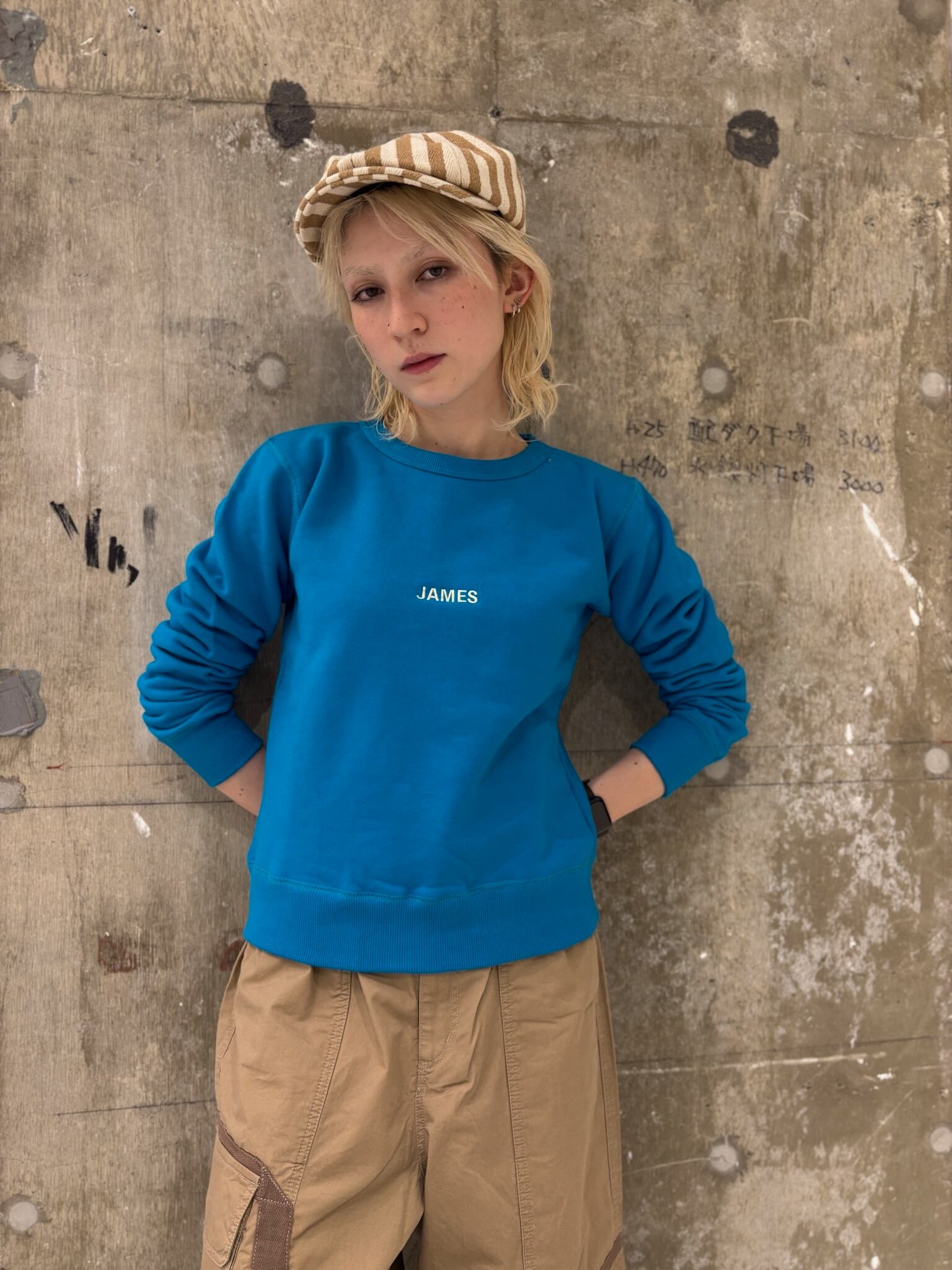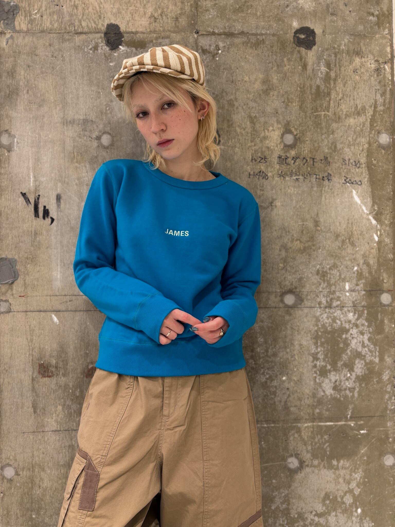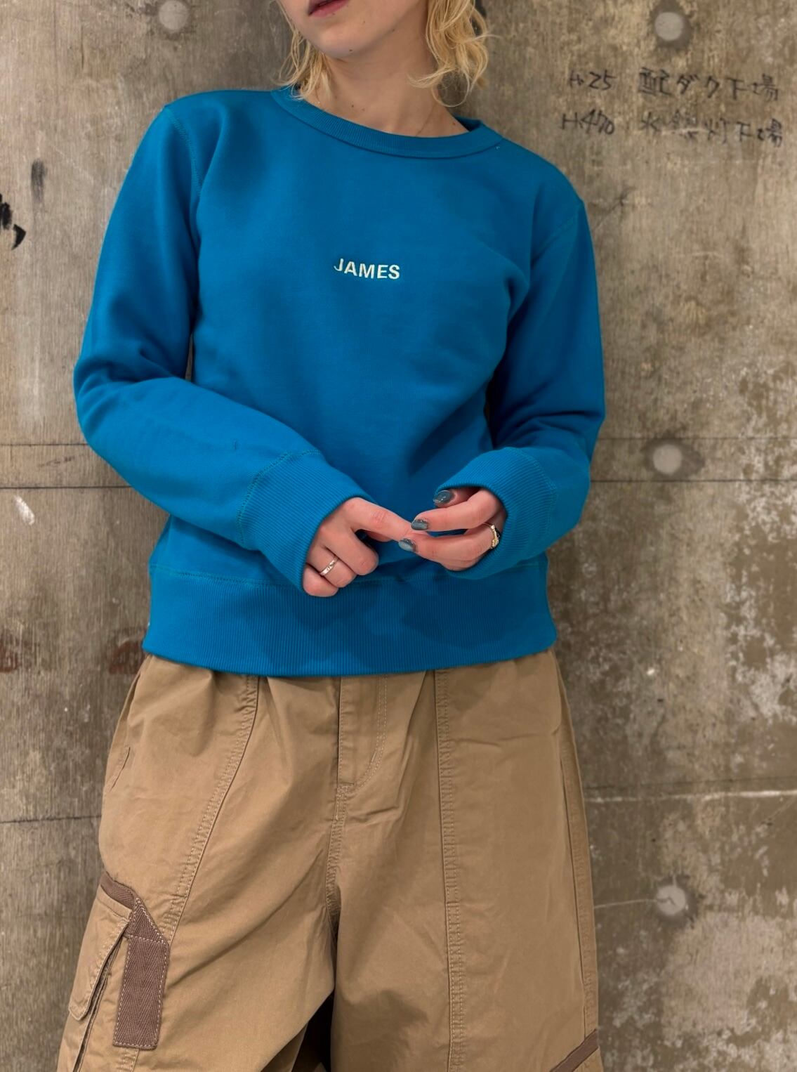 4カラー レッド/グリーン/ブルー/ピンク モデル着用カラー ブルー モデル身長159 サイズ フリー 肩幅37 身幅44 着丈54 素材 綿100%