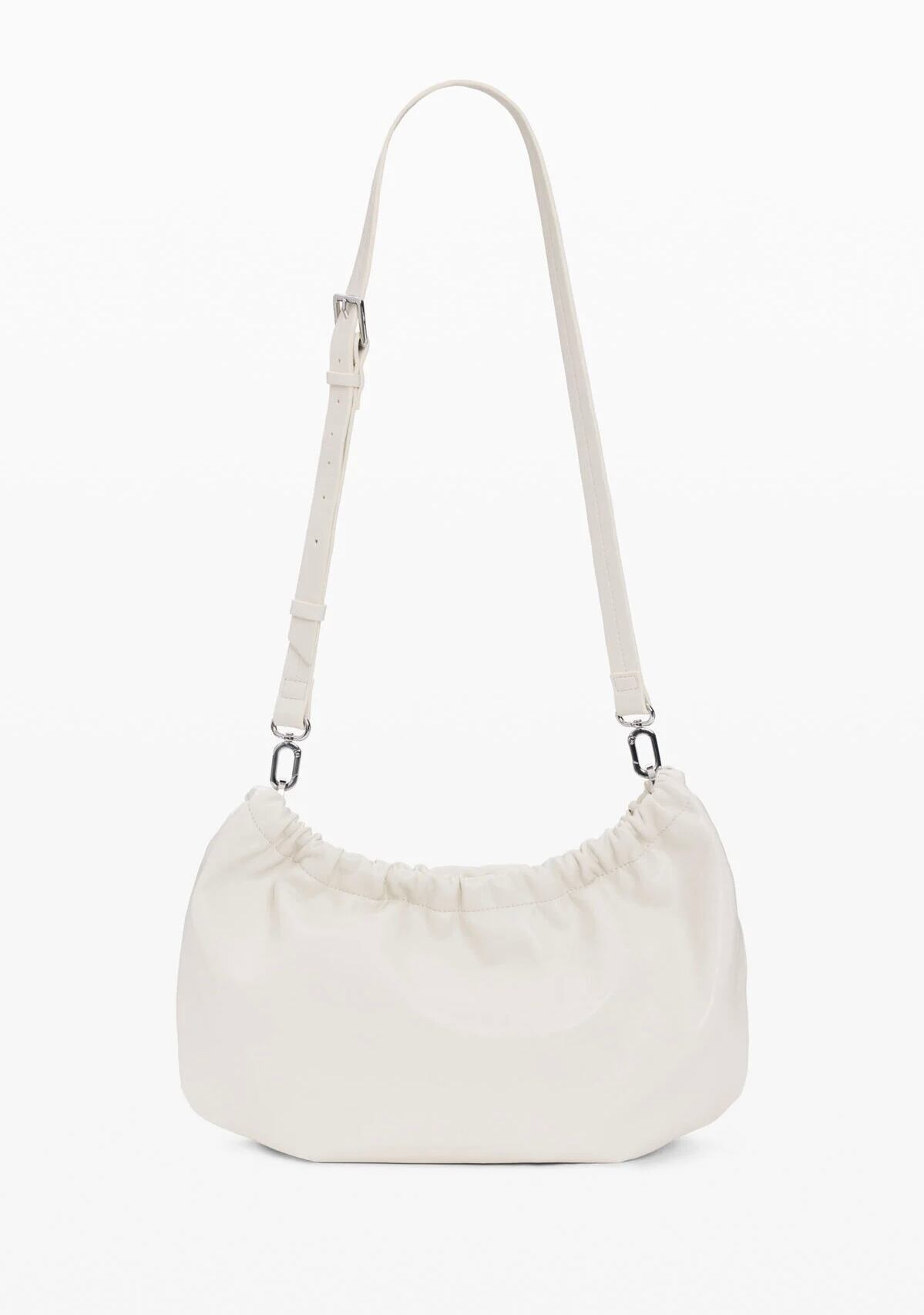 レザー調生地で仕立てたオーバル型ショルダーバッグ。トレッキングスタイルのハンドル、取り外し可能なカードホルダー付きチャーム、刻印ロゴ入り。