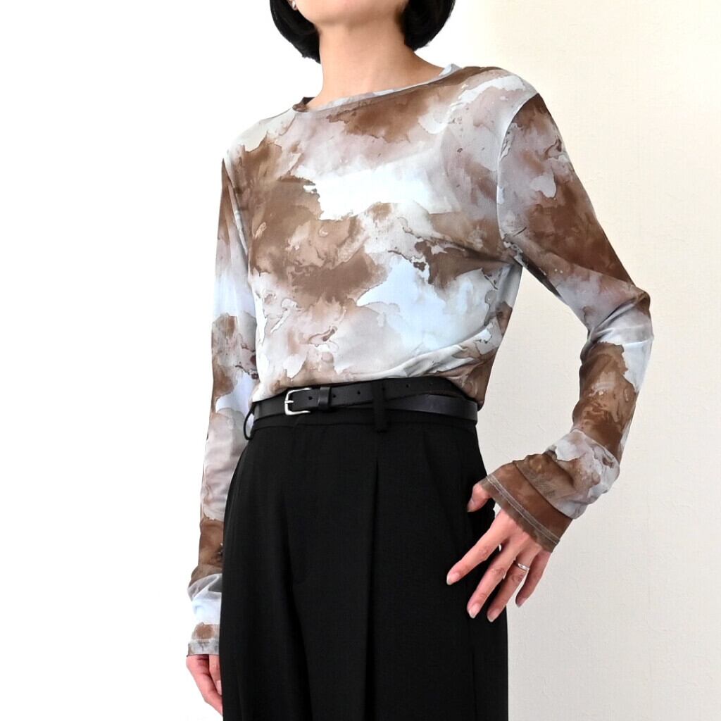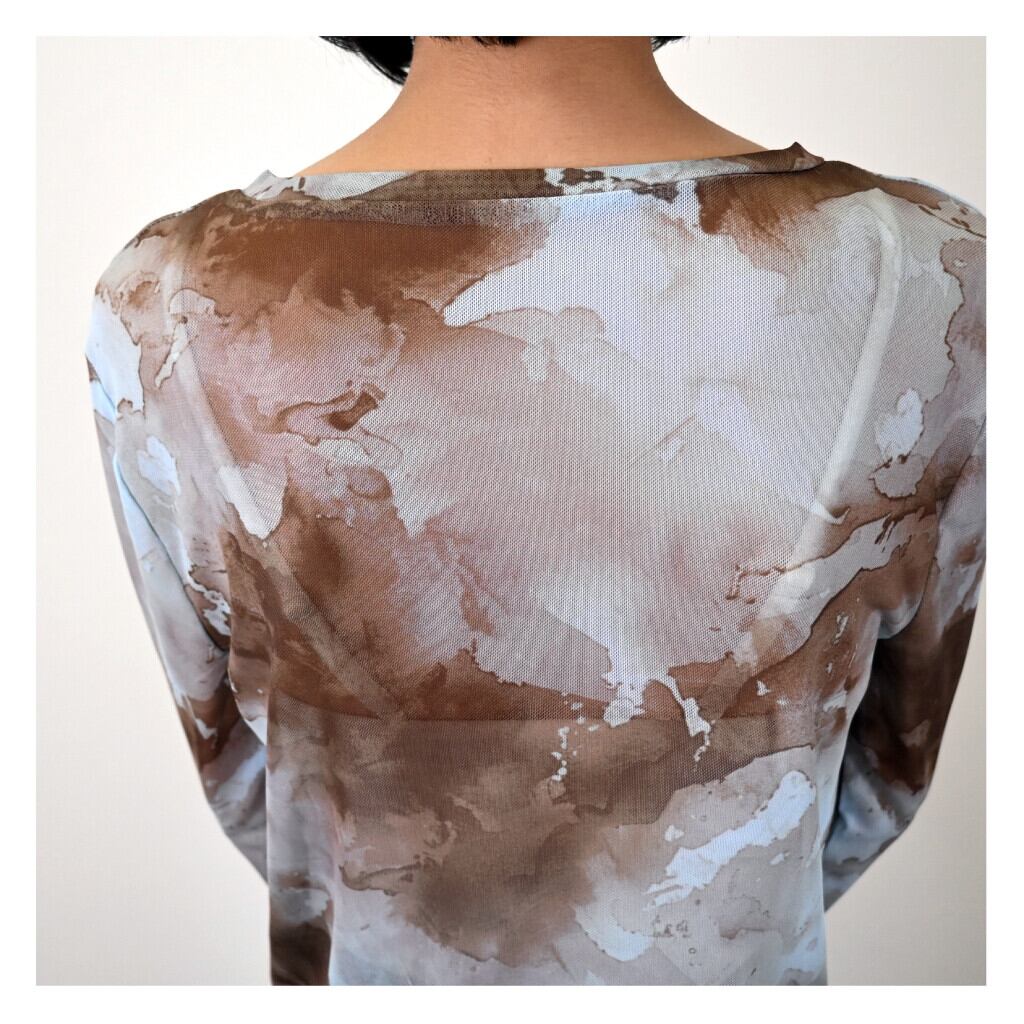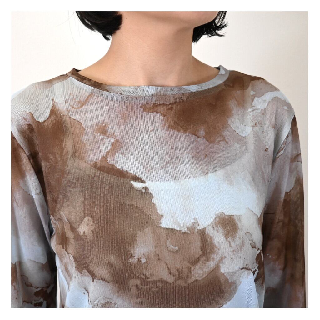 パワーメッシュペイント柄が個性的! ◎透け感を生かしてアレンジ次第で着こなしのヴァリエーションが増すお洒落アイテム。 今季らしいこなれ感を演出しこれからの季節にピッタリです! 【素材・成分】 ポリエステル94% ポリウレタン6% 【サイズ】 着丈:50cm、肩幅:38cm、バスト:76cm、 袖丈:66cm、袖口:20cm、裾周り:76cm