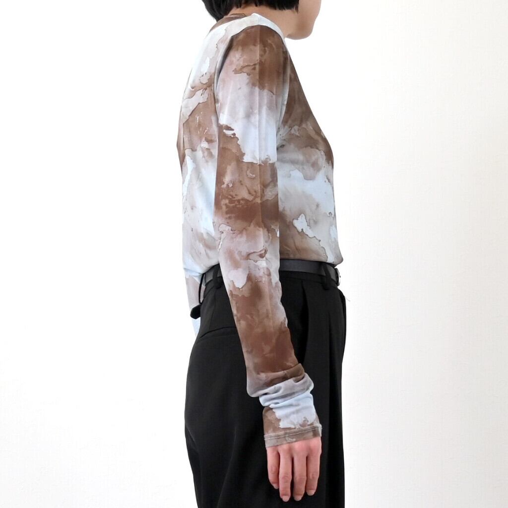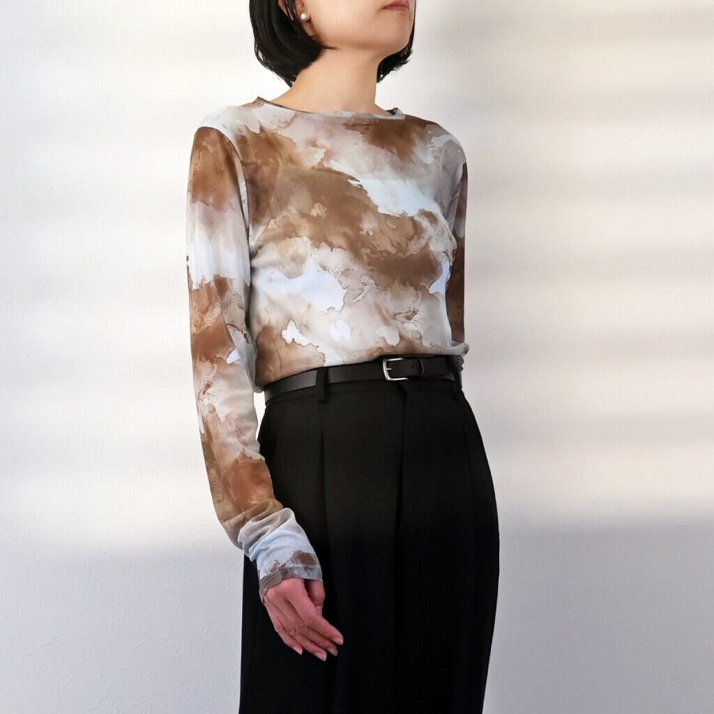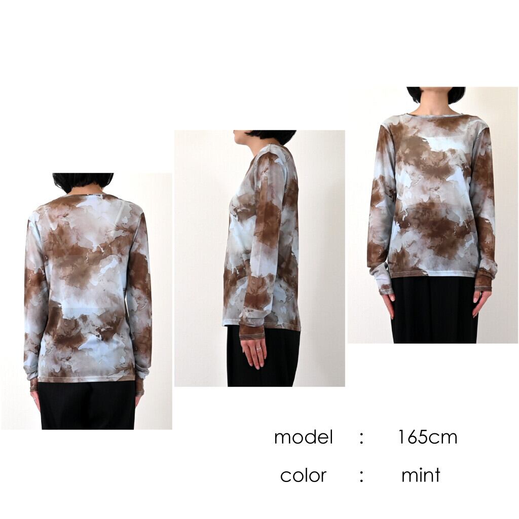 パワーメッシュペイント柄が個性的! ◎透け感を生かしてアレンジ次第で着こなしのヴァリエーションが増すお洒落アイテム。 今季らしいこなれ感を演出しこれからの季節にピッタリです! 【素材・成分】 ポリエステル94% ポリウレタン6% 【サイズ】 着丈:50cm、肩幅:38cm、バスト:76cm、 袖丈:66cm、袖口:20cm、裾周り:76cm