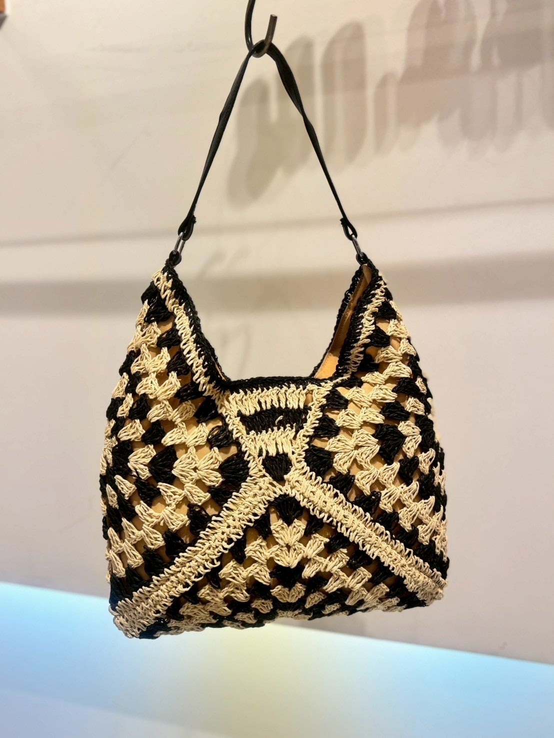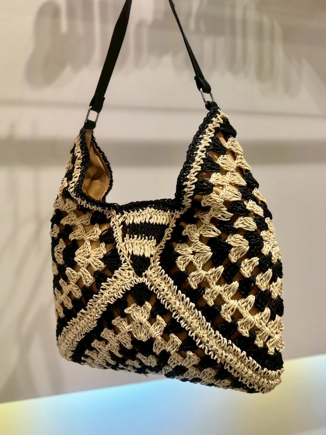 モノトーンの柄がユニークなサマーバック◎ シンプルコーデもオシャレ感がアップして見えます。