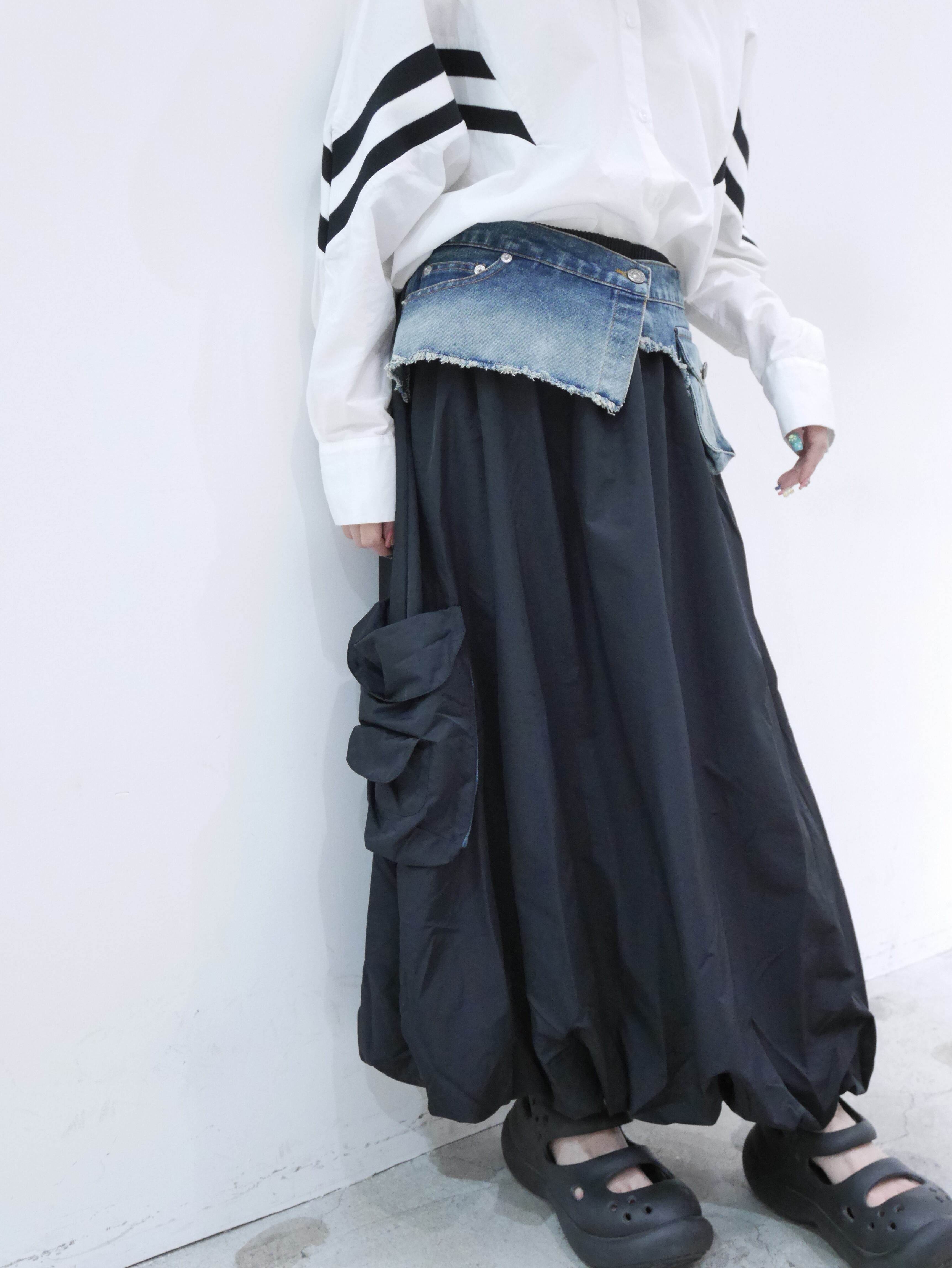 サイズM〜L ウエスト64〜77 ウエストゴム 着丈 モデル身長158 素材 デニム部分 綿100% 別布ポリエステル100%